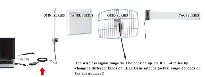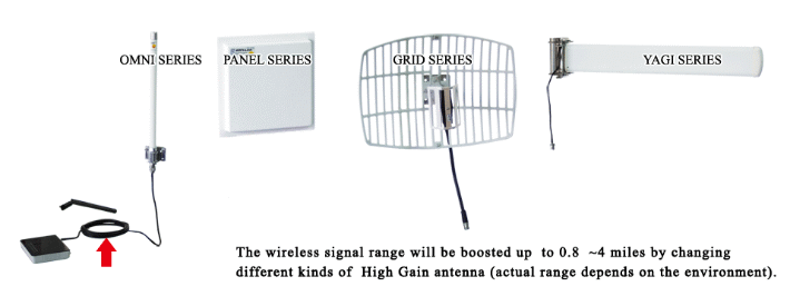 You can replace the 5-dbi dipole antennas with higher gain antennas. The HIGH POWER USB adapter boosts the ranges and strengthens the signals for high-gain antennas. WIFI-Link carries different types of high-gain antennas; and, please refer to the below pictures. |